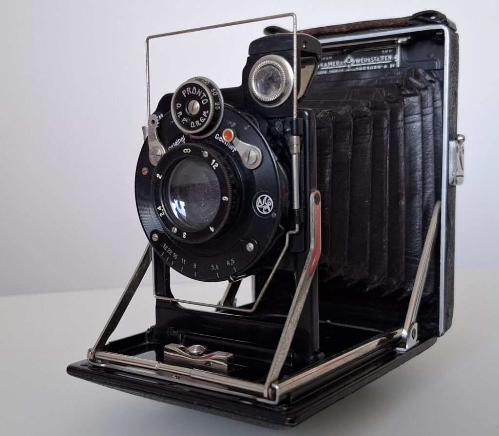 Beim Öffnen klappt die Kamera nach vorne auf. Die Frontstandarte wird herausgezogen und mit den nach vorführenden Verstrebungen in den Laufschienen fest eingehängt. Gleichzeitig wird die Kamera damit in Unendlich-Stellung gebracht. Die Fokussierung erfolgt durch ein Rad am Laufboden.