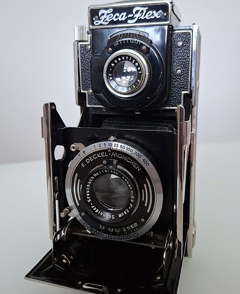 Die Zeca-Flex gehört zu den ungewöhnlichsten Kamerakonstruktionen der 1930er-Jahre: eine zweiäugige Spiegelreflexkamera (TLR), die sich wie ein klassischer Balgen-Falter kompakt zusammenfalten lässt – gedacht für Fotografen, die das komfortable Arbeiten über Mattscheibe wollten, ohne auf ein transportfreundliches Gehäuse zu verzichten. Entstanden ist dieses seltene Modell bei der Zeh-Camera-Fabrik (Paul Zeh) in Dresden; als Markenzeichen taucht „Zeca“ bereits seit den 1920er-Jahren auf.