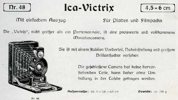 Die hier gezeigte Victrix ist eine kompakte Laufbodenkamera im kleinen Plattenformat 4,5 x 6 cm aus der Fertigung der ICA in Dresden. Produziert wurde die Kamera ab 1912. Nach der Fusion wurde die Fertigung der Victrix bei Zeiss Ikon bis 1931 fortgesetzt. Gemeinsam mit der gleichformatigen Ica Atom stellte die Victrix die kleinste Plattenkamera aus dem Hause ICA dar und wurde gezielt für ihre geringe Größe beworben.